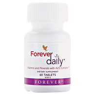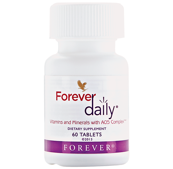 Advanced multivitamin delivered with the power of aloe. • Perfectly balanced blend of fifty-five nutrients • Exclusive AOS Complex • Gluten-free This powerful daily multivitamin delivers 100% of the recommended daily allowance (RDA) of essential vitamins and bio-available minerals and nutrients. Forever Daily combines fifty-five perfectly balanced aloe-coated nutrients including vitamins A, C, D and B12, iron, calcium and zinc. Take with the Forever Aloe Vera Gel for best results. Vitamins A, D, C, B12, iron, copper, zinc, and selenuim contribute to the normal function of the immune system
